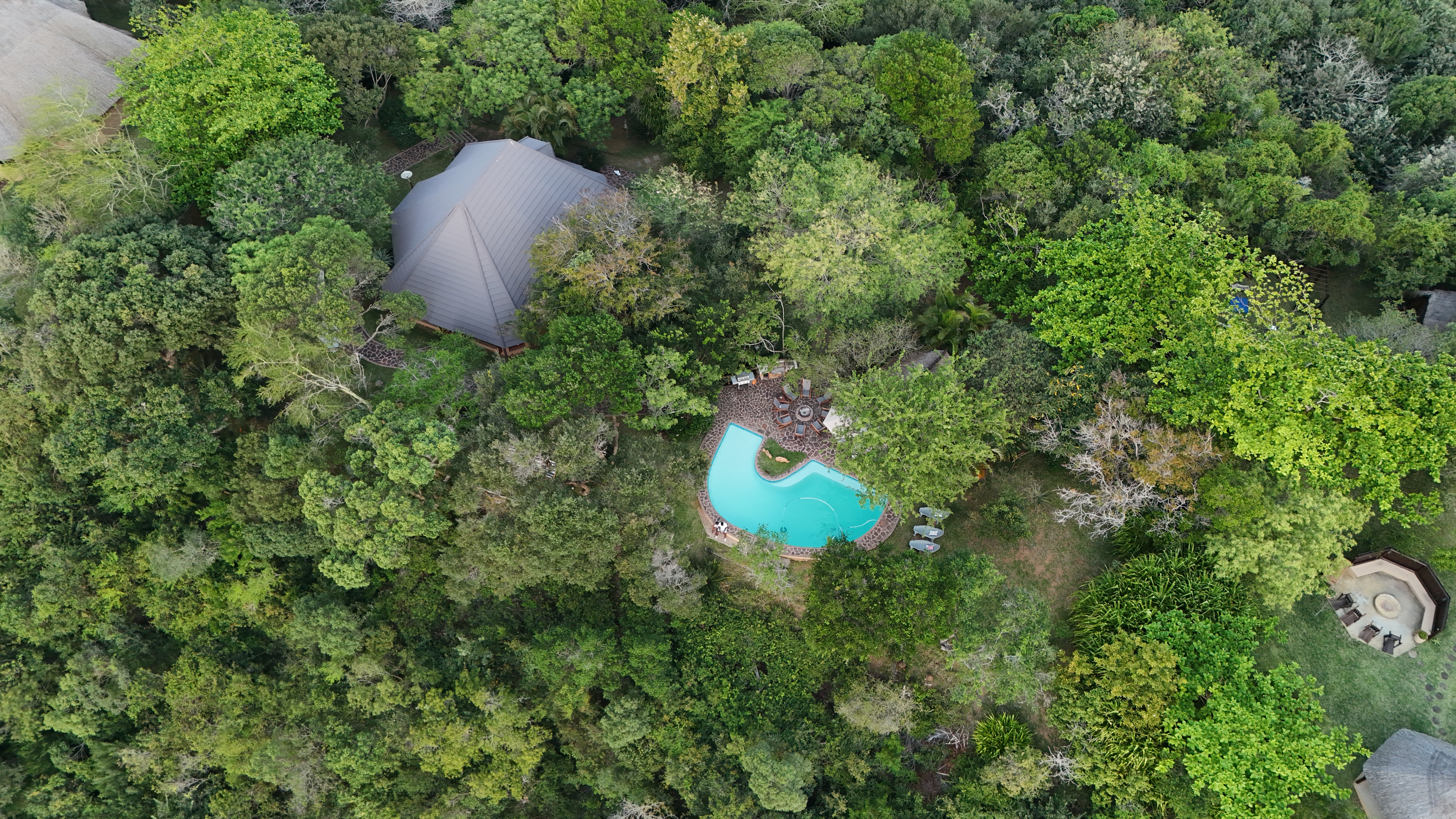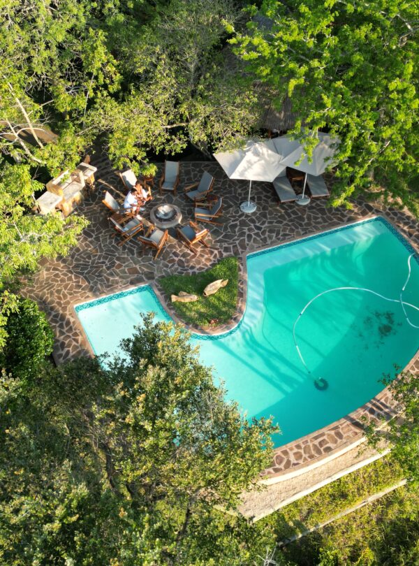- Área externa com churrasqueira (braai) e fogueira.